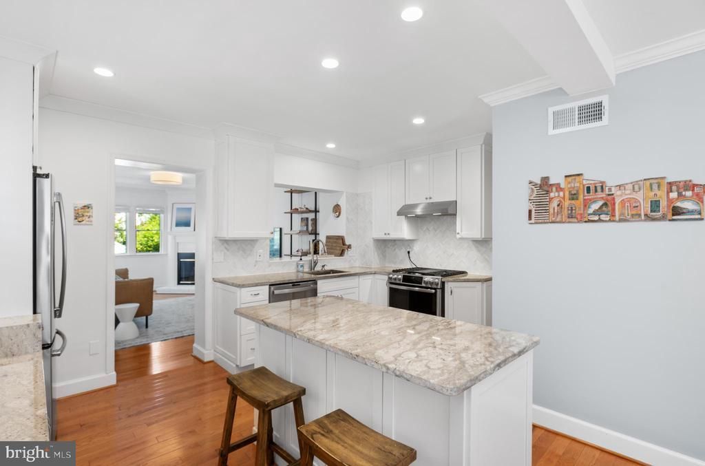 Bright and thoughtfully updated brick duplex in the heart of Del Ray, enhanced by a two-story rear addition that expands the home’s overall footprint and functionality. The main level offers a seamless layout anchored by a fully renovated kitchen with a center island, opening to inviting living and dining spaces with hardwood floors and a wood-burning fireplace. Upstairs features two bedrooms and two full baths, including a spacious primary suite with 12’ vaulted ceilings and an ensuite primary bathroom. A flexible interleading den offers the option for a third bedroom, home office, or additional living space. The lower level includes a generous recreation area, a dedicated laundry/utility room, and the potential to add a third full bath. A fully fenced backyard and rare off-street driveway parking complete the home’s thoughtful features.